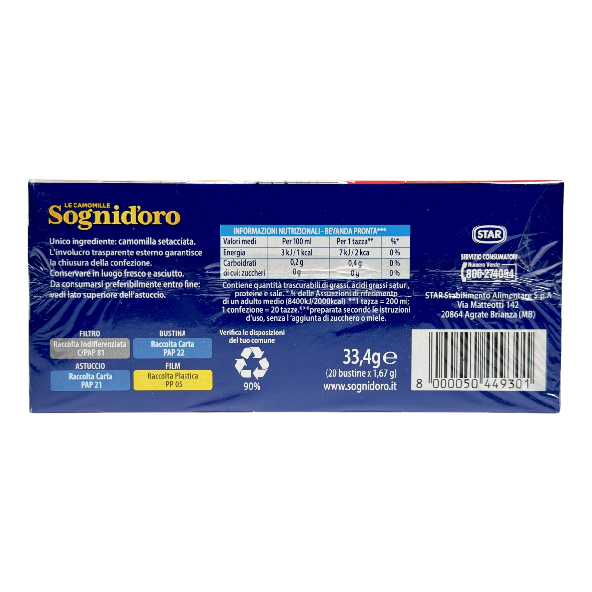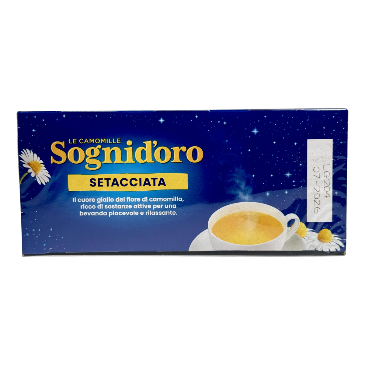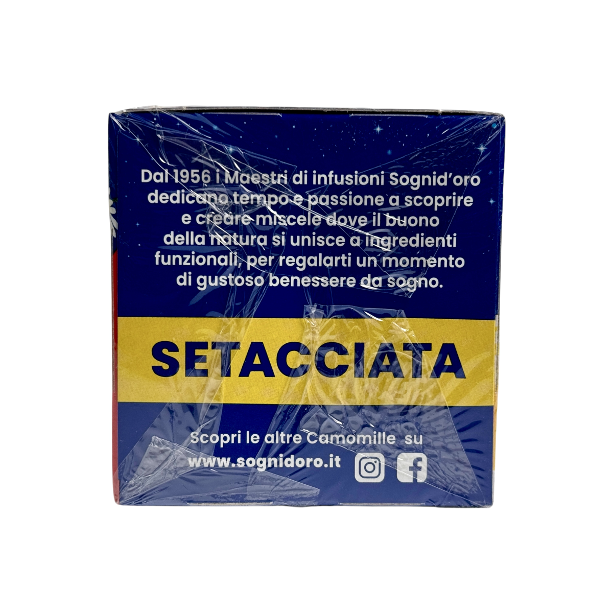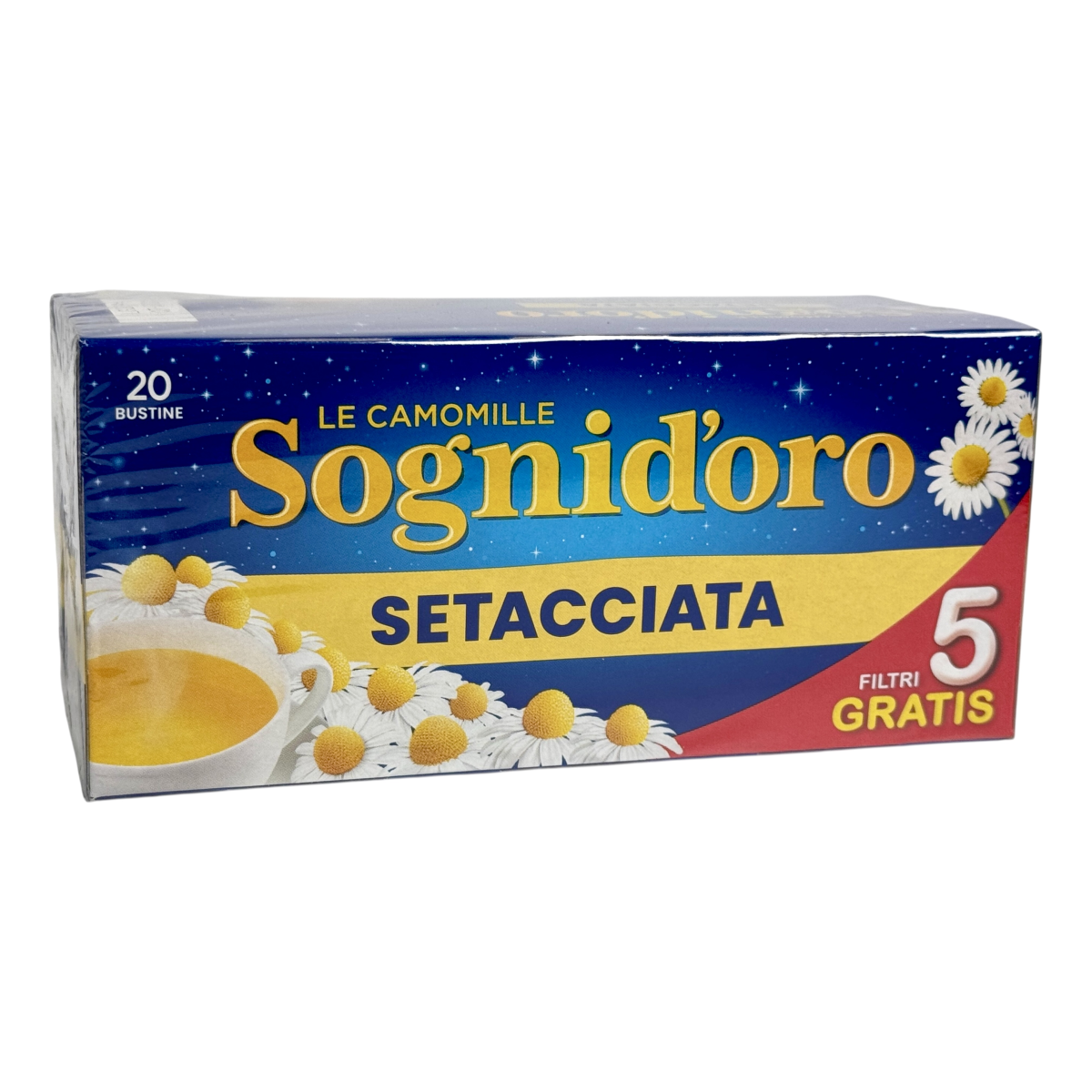 Sognid’oro — провідний бренд трав’яних чаїв в Італії, відомий своєю якістю та натуральними інгредієнтами. Лінійка Setacciata виготовлена з відбірної подрібненої ромашки, яка зберігає природний аромат і цілющі властивості рослини. Чай не містить ароматизаторів, цукру чи консервантів, тому підходить для щоденного вживання всією родиною. Упаковка включає 20 пакетиків плюс 5 у подарунок.