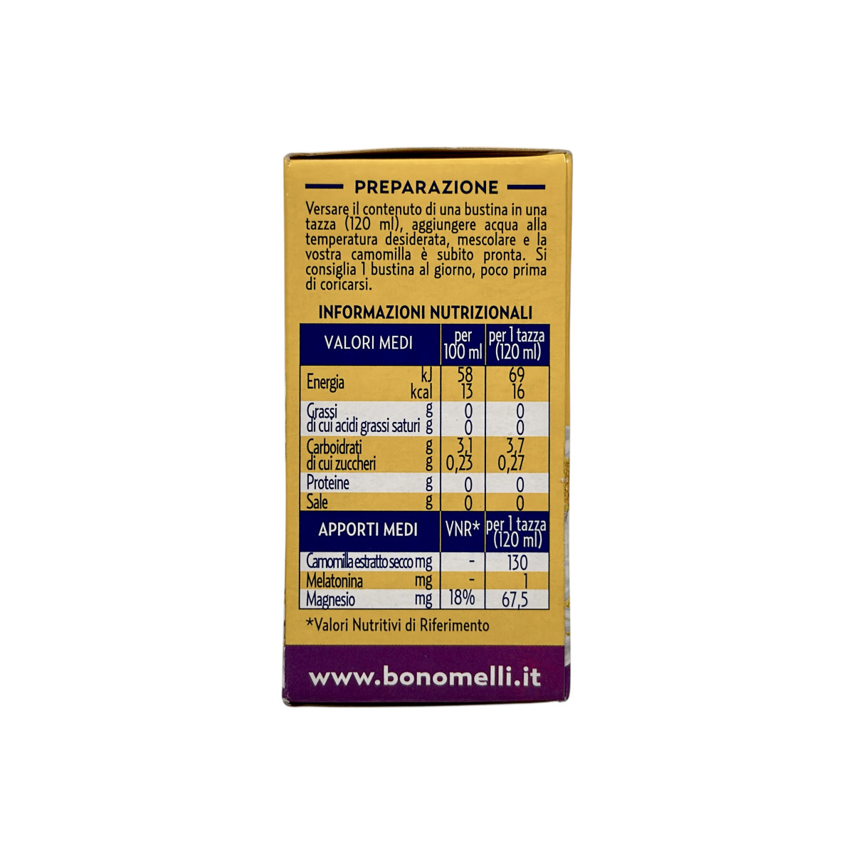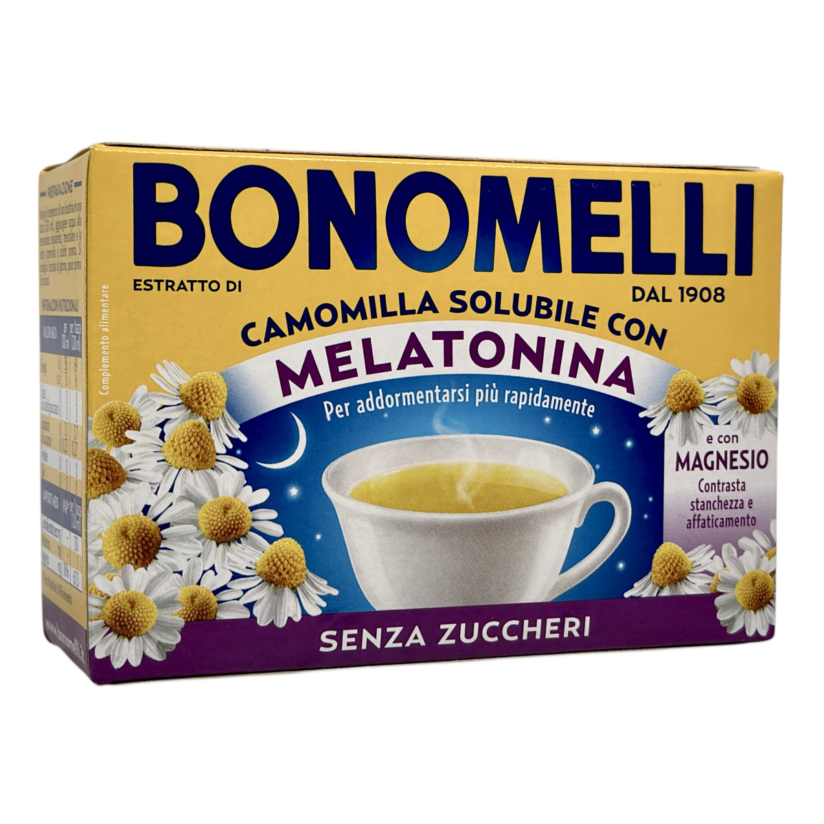 Bonomelli — легендарний італійський бренд, що з 1908 року створює натуральні фітопродукти для здоров’я та гармонії. Формула Camomilla Solubile con Melatonina e Magnesio поєднує екстракт ромашки, який заспокоює нервову систему, мелатонін, що сприяє швидшому засинанню, та магній, який зменшує втому й напруження. Без доданого цукру, з приємним ванільним ароматом — ідеальний вечірній напій для спокійного сну.