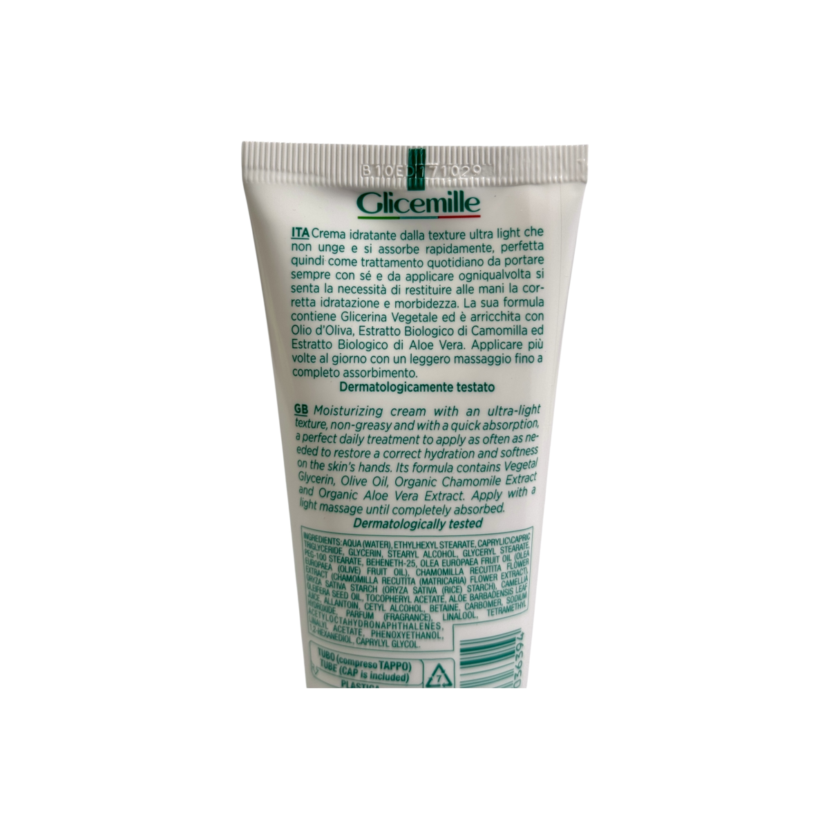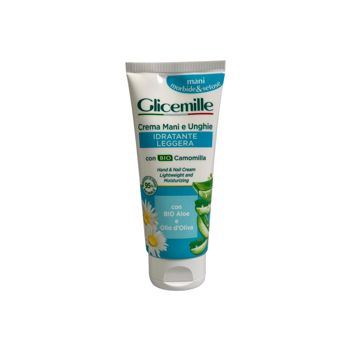 Відчуйте ніжний щоденний догляд із кремом для рук і нігтів Glicemille Idratante Leggera. Це оригінальний продукт з Італії, що містить 95% інгредієнтів натурального походження. Його легка текстура швидко вбирається, не залишає жирної плівки та забезпечує миттєве зволоження. Завдяки біо ромашці та алое вера крем заспокоює шкіру, а оливкова олія й гліцерин роблять її м’якою та еластичною. Підходить для щоденного використання, ідеальний навіть для чутливої шкіри.