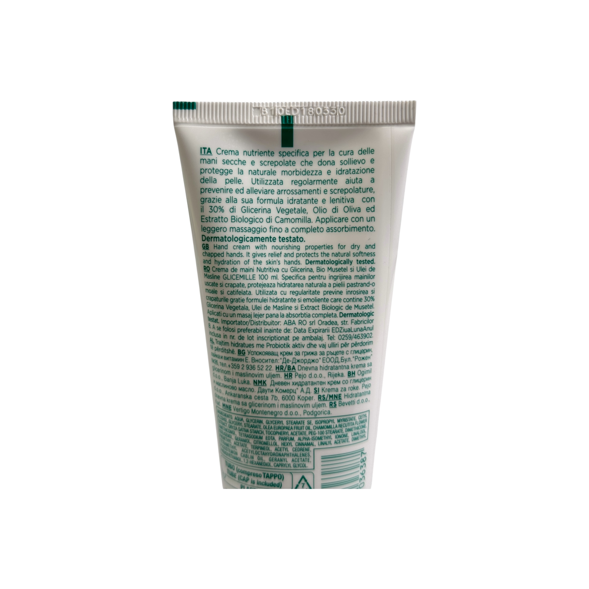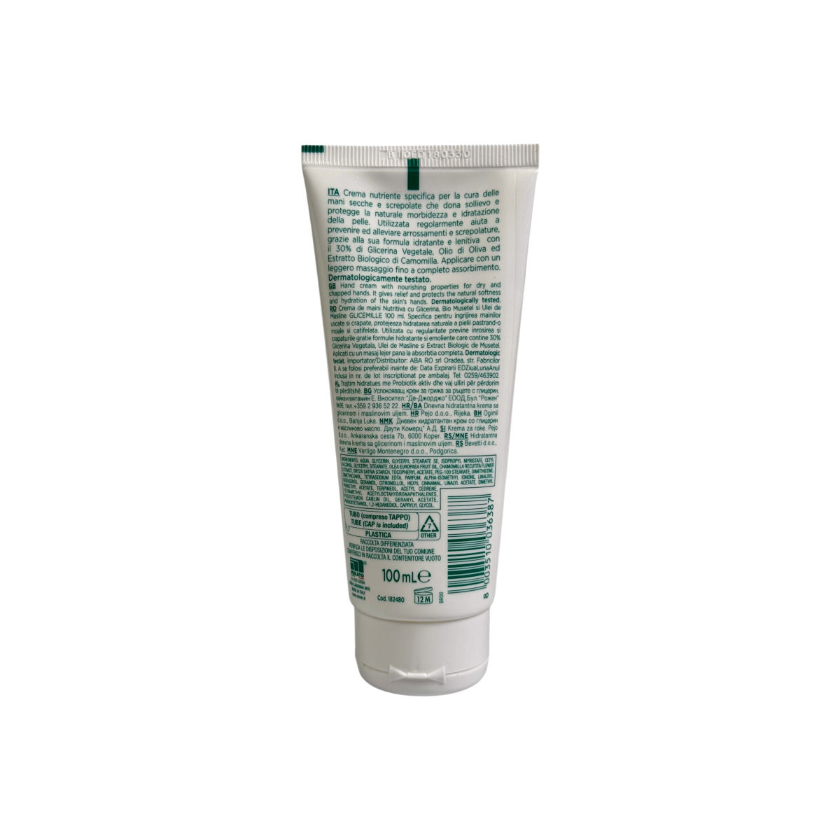 Відчуйте ніжність і догляд з італійським кремом для рук Glicemille Nutriente. Це оригінальний продукт для внутрішнього ринку Італії, який поєднує силу натуральних інгредієнтів — біо ромашки, рослинного гліцерину та оливкової олії. Крем швидко вбирається, живить і зволожує навіть суху та потріскану шкіру, даруючи відчуття комфорту і м’якості. При регулярному використанні він допомагає відновити природну еластичність і захищає від шкідливого впливу зовнішніх факторів.