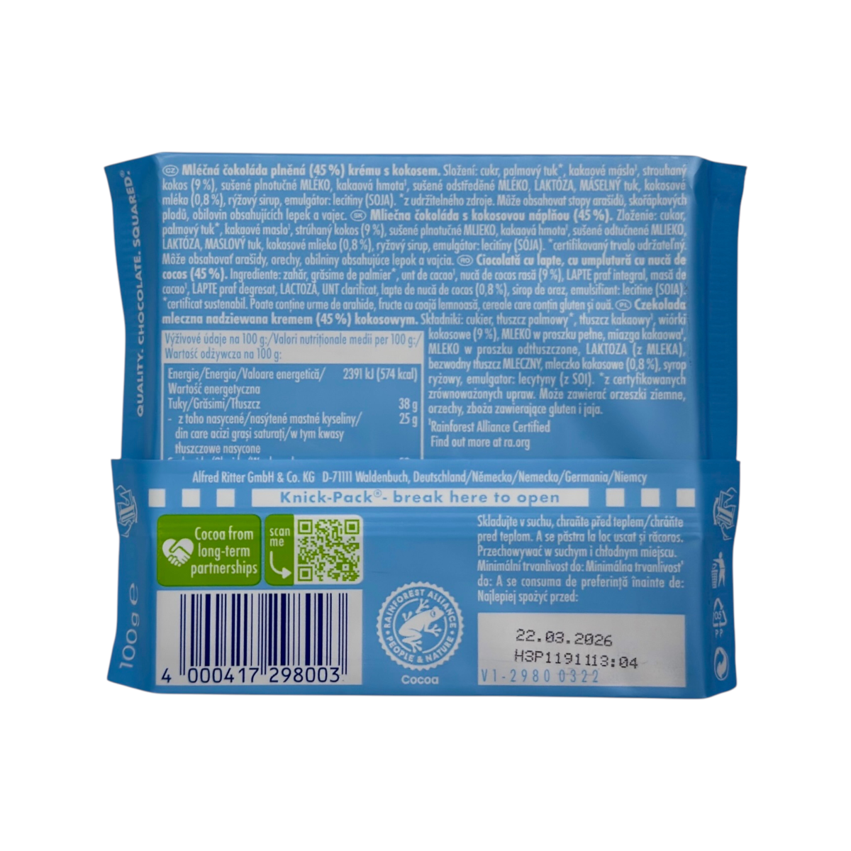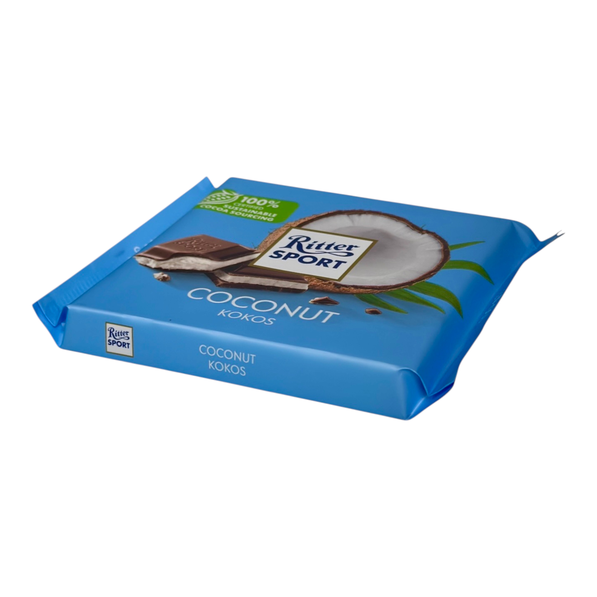 Ritter Sport Coconut – це класична плитка німецького шоколаду у квадратному форматі. Поєднання молочного шоколаду та 45% начинки з кокосовим кремом дарує насичений тропічний смак із вершковою ніжністю. Використовується тільки сертифіковане какао з програм сталого виробництва Rainforest Alliance.