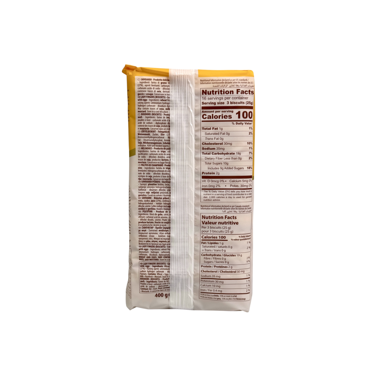 Lago Savoiardi — це класичні італійські «дамські пальчики», легке й повітряне бісквітне печиво з ніжною текстурою та легким ванільним ароматом. Воно ідеально підходить для приготування традиційного тірамісу, чизкейків, морозива та десертних тортів. Завдяки пористій структурі Savoiardi добре вбирають каву, лікер або сироп, зберігаючи при цьому форму та ніжність.