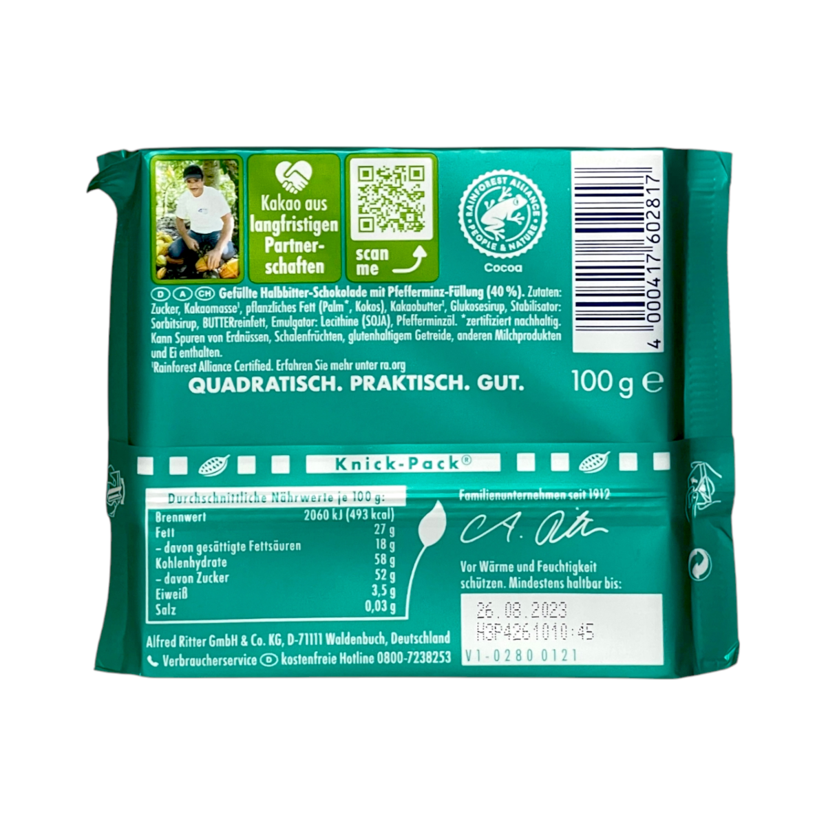 Шоколад чорний Ritter Sport з м’ятним кремом pfefferminz, 100 г