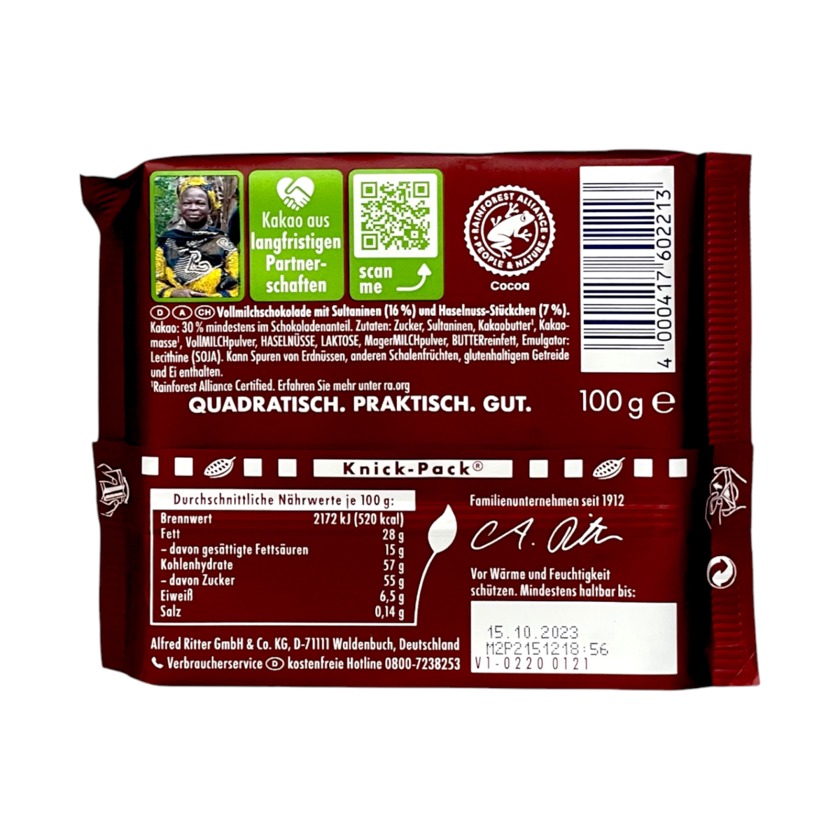 Шоколад молочний Ritter Sport з родзинками та горіхом trauben nuss, 100 г
