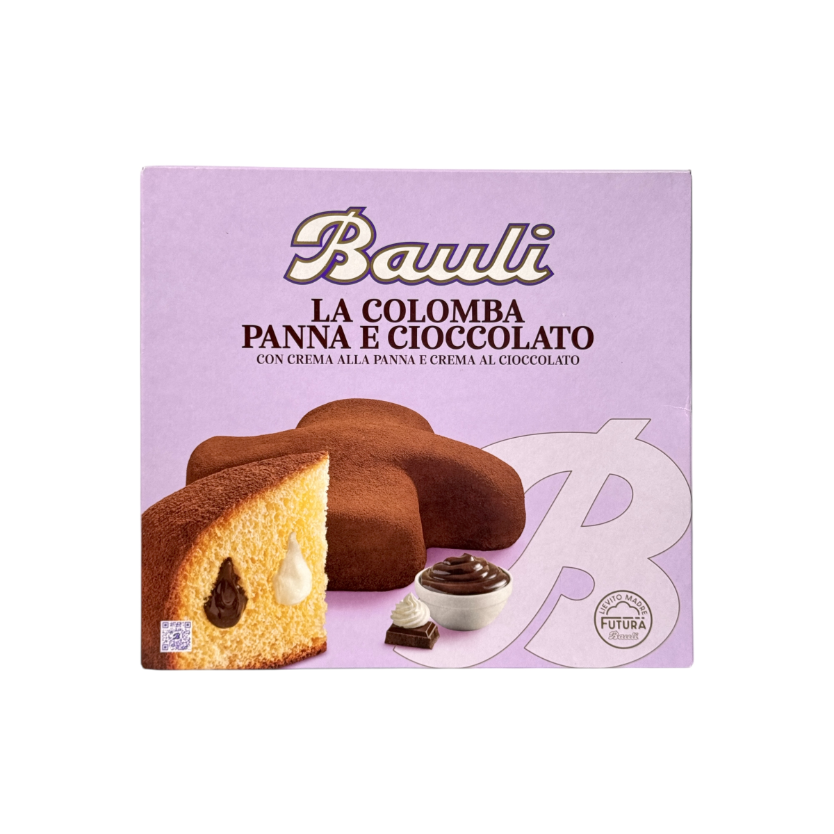 Bauli La Colomba Panna e Cioccolato — ароматна випічка з повітряного тіста, наповнена двома видами крему: ніжним вершковим і насиченим шоколадним. Виготовлена за оригінальним рецептом у Вероні з використанням натуральних інгредієнтів, без консервантів та штучних ароматизаторів. Легка текстура, гармонійний смак і делікатна солодкість роблять цю коломбу справжньою італійською класикою для святкового столу.
