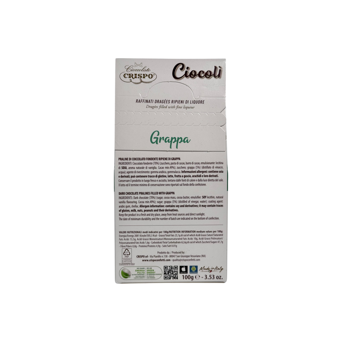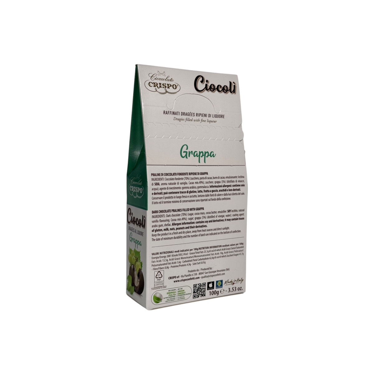 Це вишукані цукерки з темного шоколаду (70% какао), всередині яких знаходиться ароматна італійська граппа. Поєднання гіркуватого смаку шоколаду та насичених винних нот створює гармонійний баланс, що ідеально підходить для поціновувачів оригінальних десертів. Crispo — італійський бренд з багаторічними традиціями, який поєднує високу якість інгредієнтів та інноваційні рецептури.