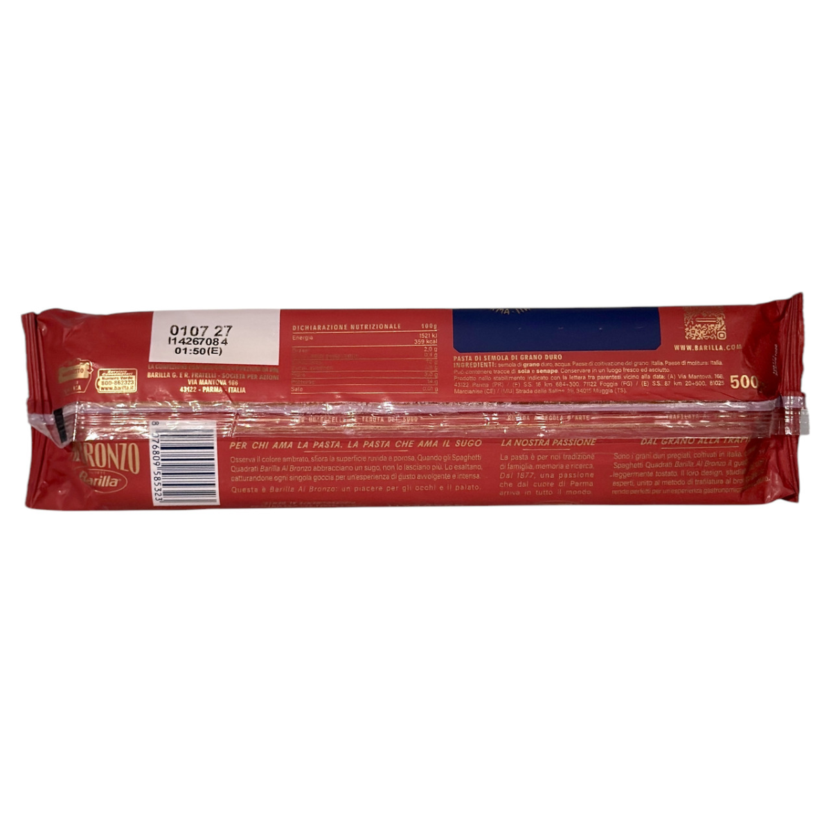 Макарони преміумкласу для справжніх гурманів! Спагеті Barilla Al Bronzo Quadrati виготовлені з добірної твердої пшениці з Італії та мають унікальну квадратну форму. Завдяки спеціальній бронзовій матриці їх поверхня ідеально утримує соус, створюючи справжню гастрономічну насолоду в кожному шматочку. Ідеально підходять до томатних, вершкових і м’ясних соусів. Час приготування – 12 хвилин. Продукт не містить ГМО та штучних домішок. Вироблено в Італії.