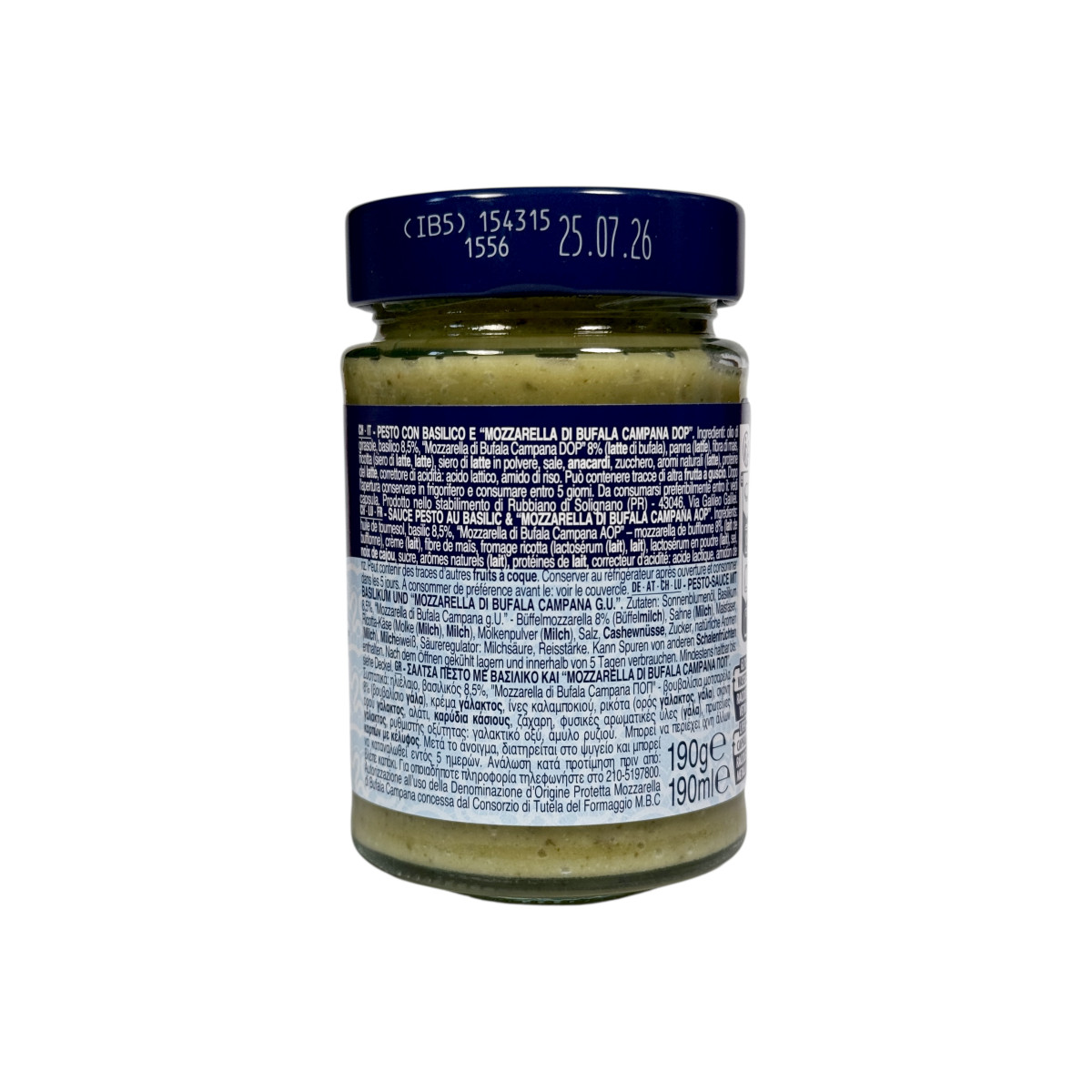 ???? Склад: Базилік 8,5%, моцарела буйволів Кампанія DOP 6% (молоко буйволів), соняшникова олія, кеш'ю, пармезан, пекоріно романо, сіль, часник, кислота лимонна, антиоксидант (аскорбінова кислота)
