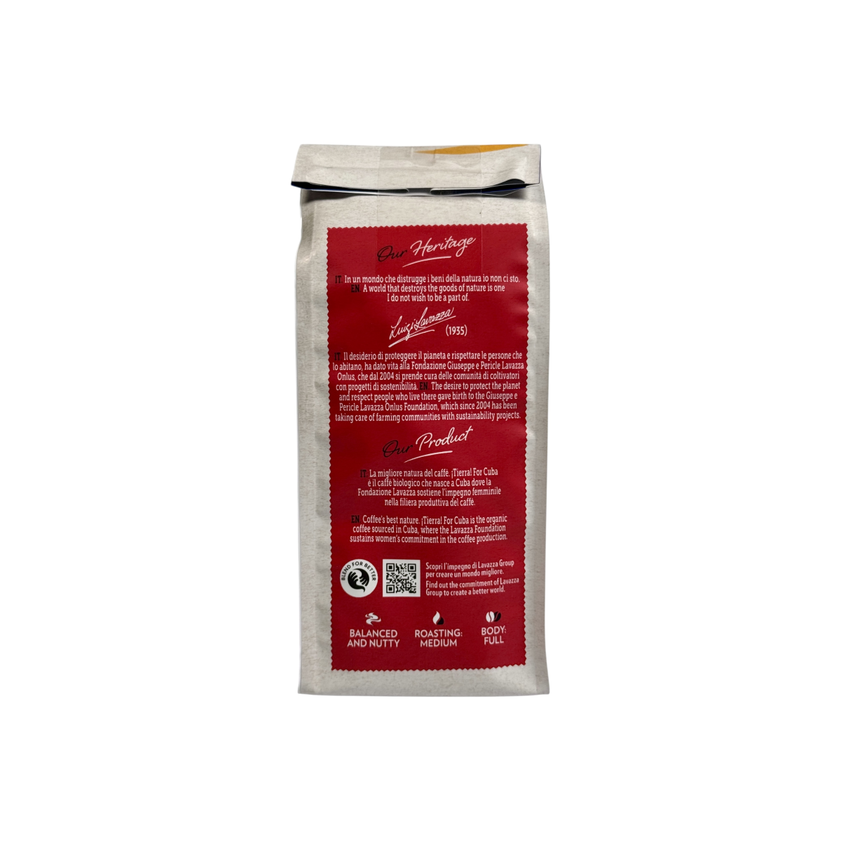 Lavazza Tierra For Cuba Bio Organic — це частина унікальної лінійки Lavazza ¡Tierra!, яка підтримує соціальні та екологічні проєкти у країнах вирощування кави. Зерна збираються вручну на Кубі, де поєднання ґрунту та клімату формує неповторний характер смаку. Кава має середнє обсмаження, збалансовану кислотність і повне тіло. Це органічний продукт, сертифікований ЄС, що підтверджує його чистоту та натуральність. Ідеально підходить для приготування чорної кави у френч-пресі, турці або кавоварці.