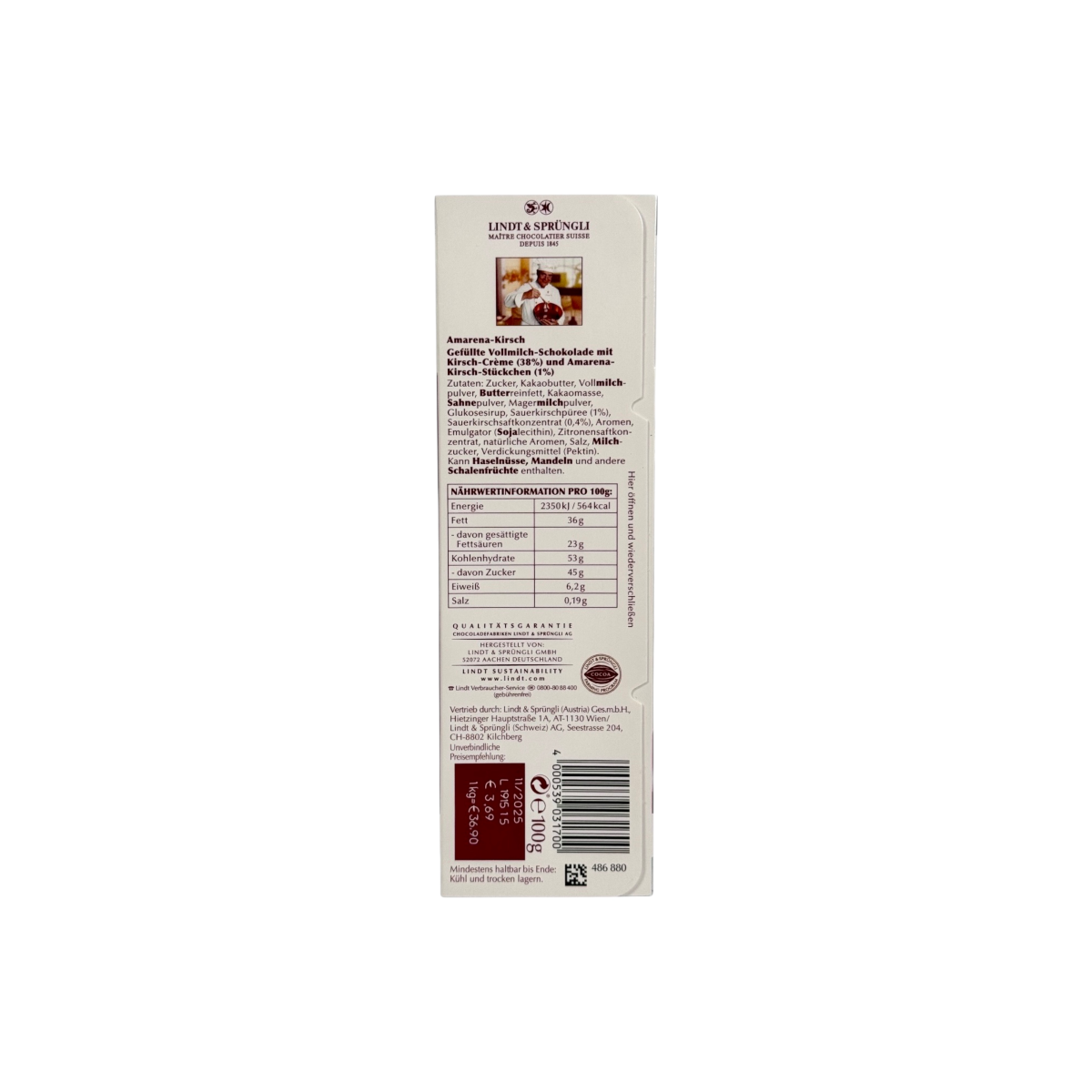 Вишуканий молочний шоколад від Lindt із соковитим вишневим кремом (38%) та шматочками вишні Амарена (1%). Це поєднання ніжності швейцарського шоколаду та фруктової свіжості створює гармонійний смак, що ідеально підходить для справжніх гурманів.