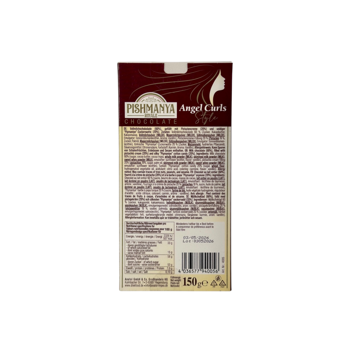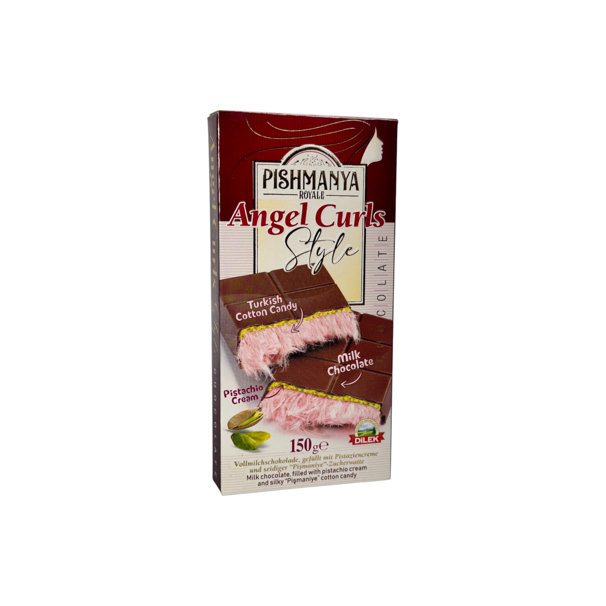 Вишуканий десерт Pishmanya Royale Angel Curls Style поєднує ніжний молочний шоколад, кремову фісташкову начинку та традиційну турецьку цукрову вату pishmaniye. Це не просто шоколад, а справжнє солодке мистецтво, яке дарує нові гастрономічні враження.