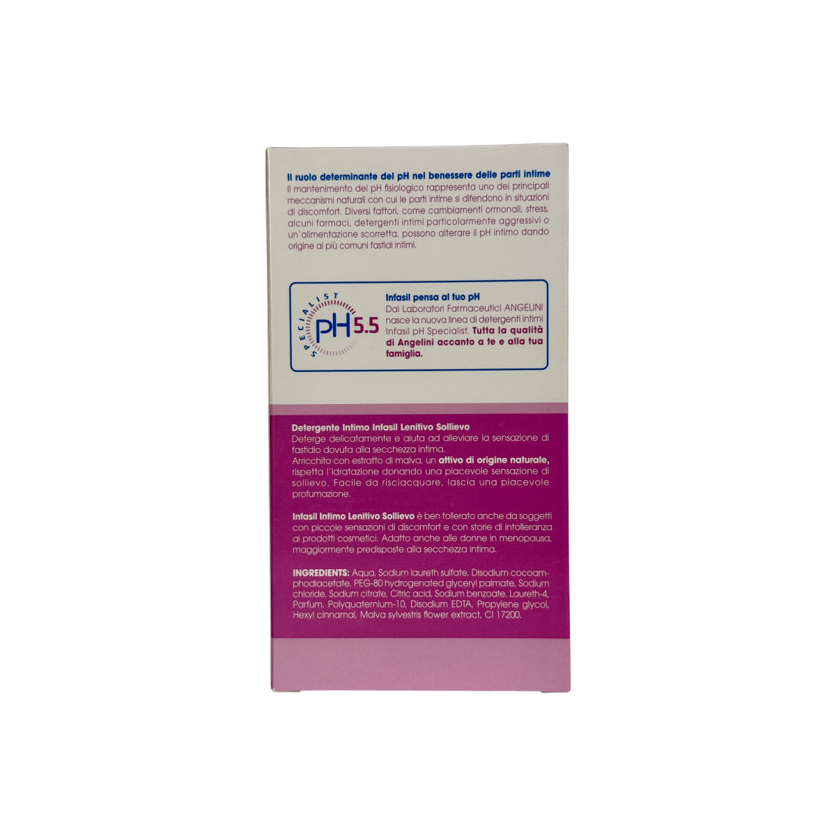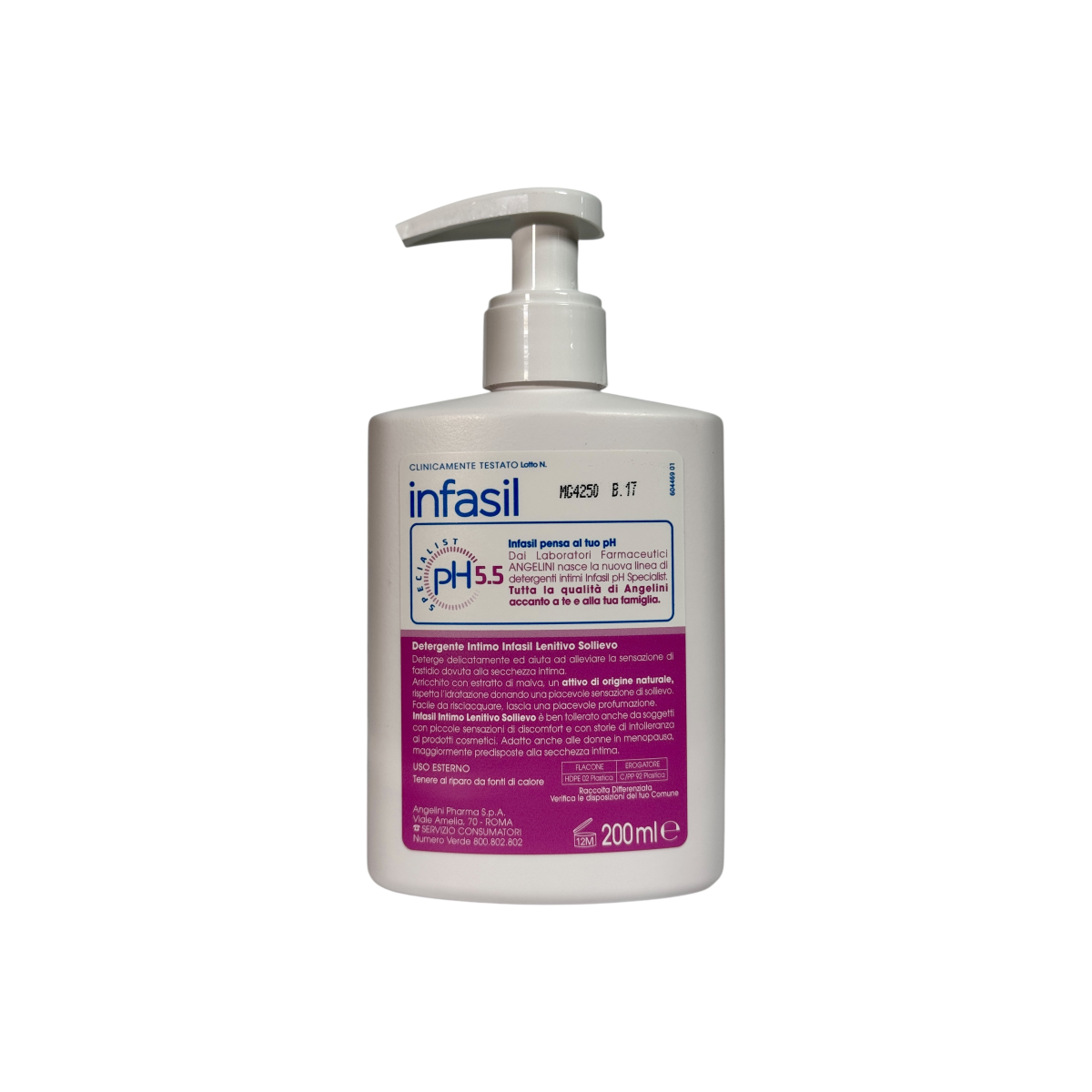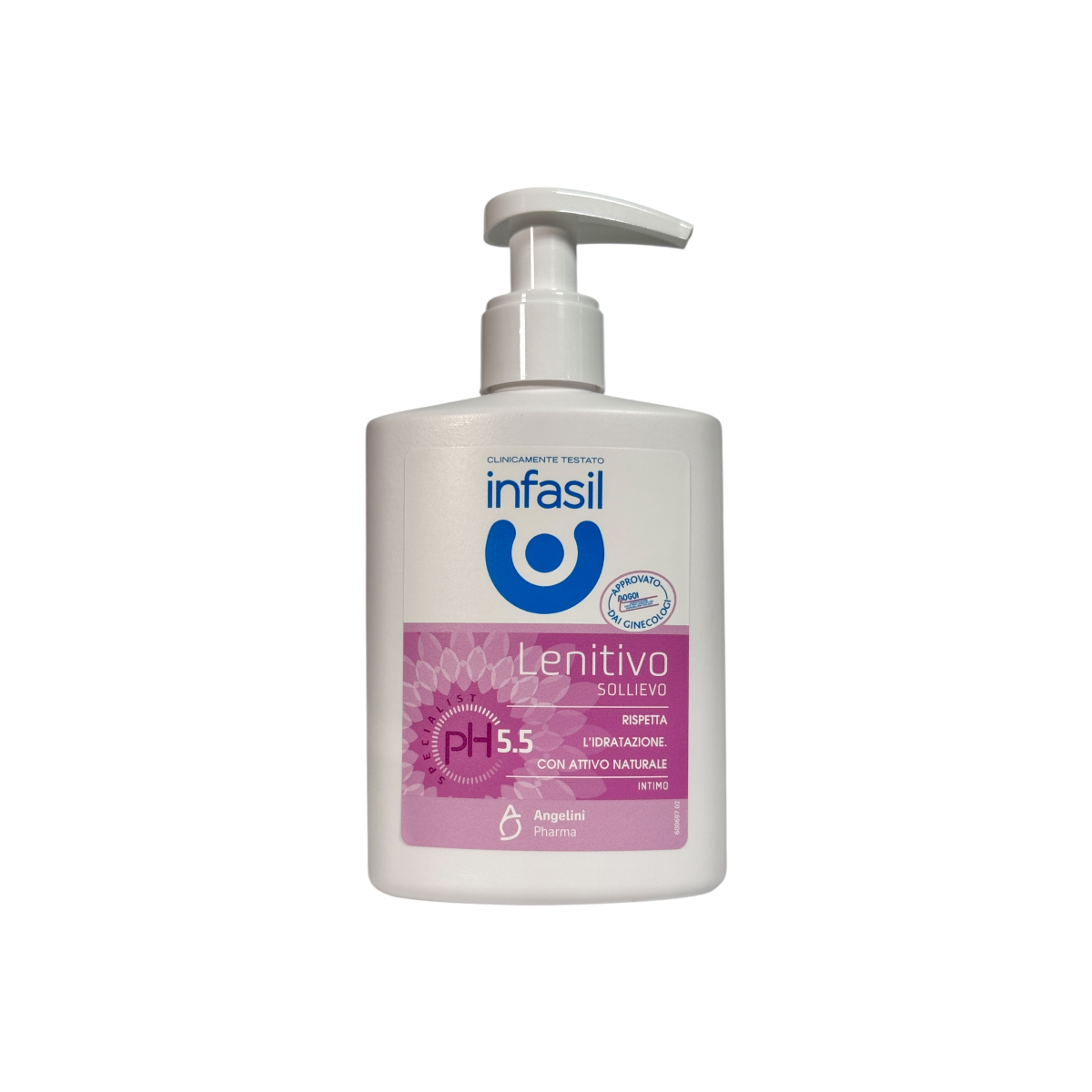 Infasil Lenitivo Sollievo спеціально розроблений для щоденного догляду за чутливою шкірою інтимної зони. Його формула з екстрактом мальви м’яко очищує, зволожує та дарує відчуття свіжості й комфорту. Оптимальний рівень pH 5.5 допомагає підтримувати природну мікрофлору та запобігає сухості, особливо у періоди гормональних змін або підвищеної чутливості.