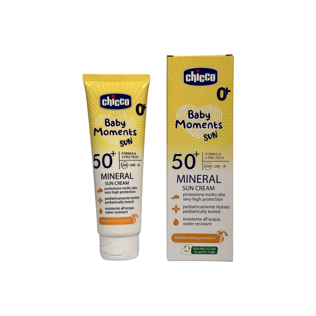 Chicco Baby Moments Sun Mineral SPF 50+ — це мінеральний сонцезахисний крем з ультрависоким рівнем захисту, створений спеціально для ніжної дитячої шкіри з перших днів життя.