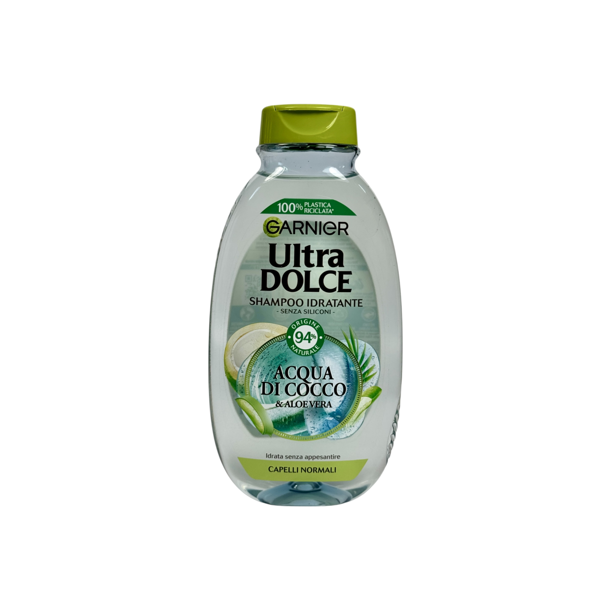 Зволожуючий шампунь Garnier Ultra Dolce з кокосовою водою та алое вера м’яко очищає волосся, надаючи йому легкість і свіжість без обтяження.