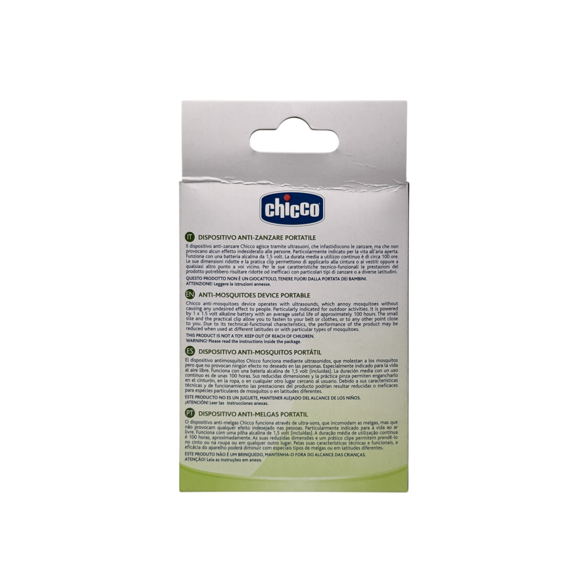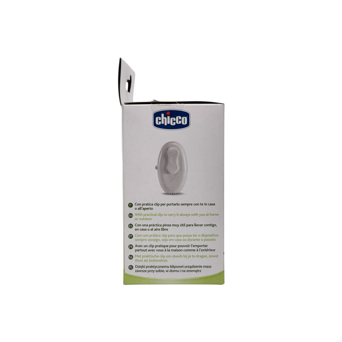 Портативний ультразвуковий відлякувач комарів Chicco — ідеальний супутник для літніх прогулянок, поїздок на природу чи використання біля дитячого візка. Пристрій випромінює ультразвук, що відлякує комарів, не створюючи дискомфорту для людини. Працює від батарейки 1.5V (входить у комплект) і забезпечує до 100 годин автономної роботи. Компактний розмір і кліпса дозволяють легко закріпити його на одязі, візку чи сумці. Ми постачаємо лише оригінальні товари з Італії, виготовлені для внутрішнього ринку. У нас — найкраща якість і жодних компромісів.