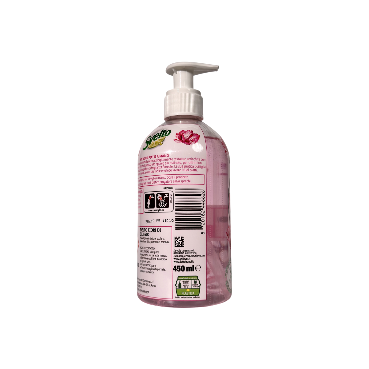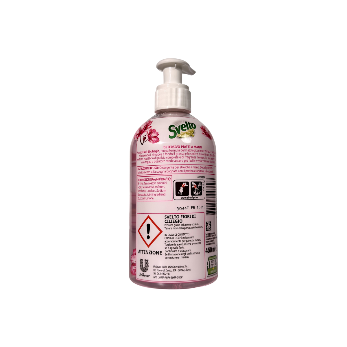 Svelto Fiori di Ciliegio — це італійський засіб для миття посуду, створений на основі дерматологічно протестованої формули з натуральними ефірними оліями. Він легко видаляє жир навіть у холодній воді, залишаючи посуд ідеально чистим і блискучим. Завдяки приємному квітковому аромату вишневого цвіту процес миття стає приємним і ніжним для шкіри рук. Практичний дозатор дозволяє економно використовувати засіб і уникати перевитрати.