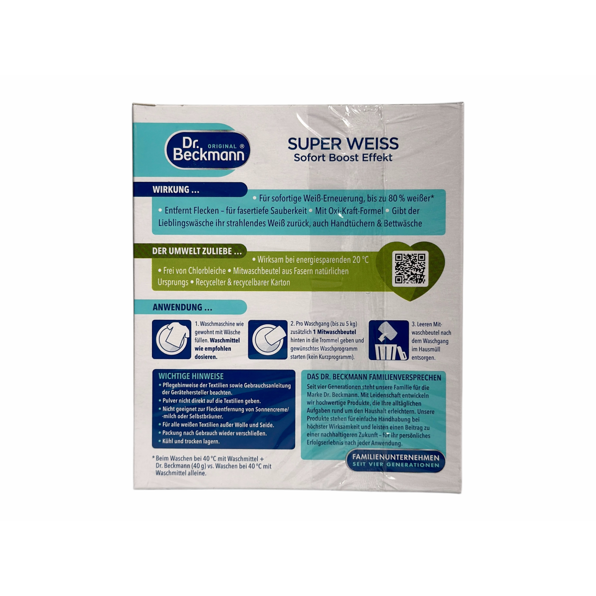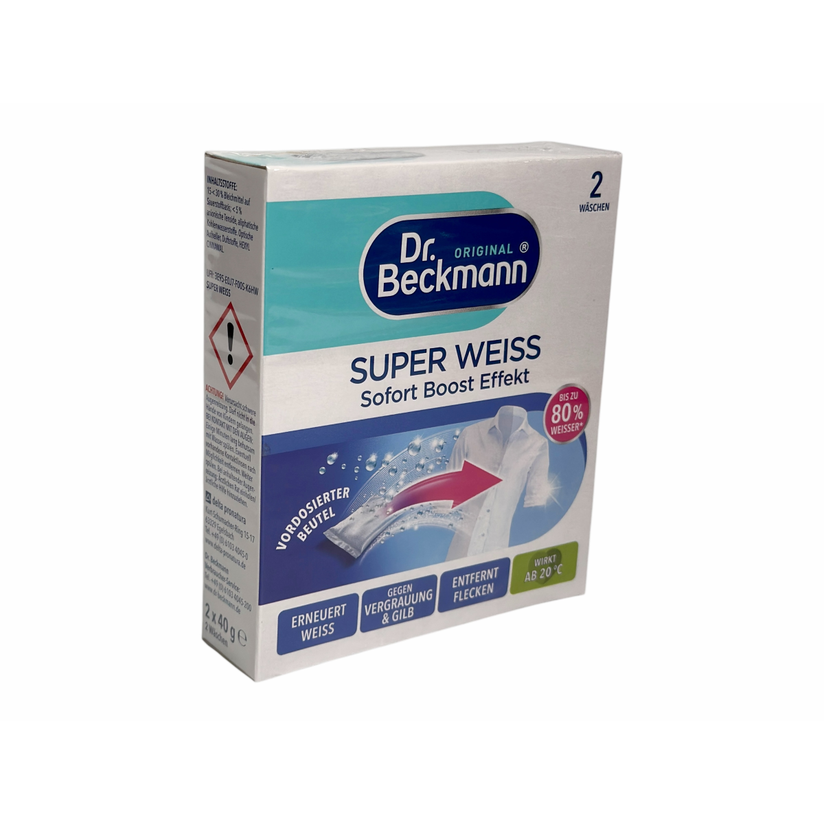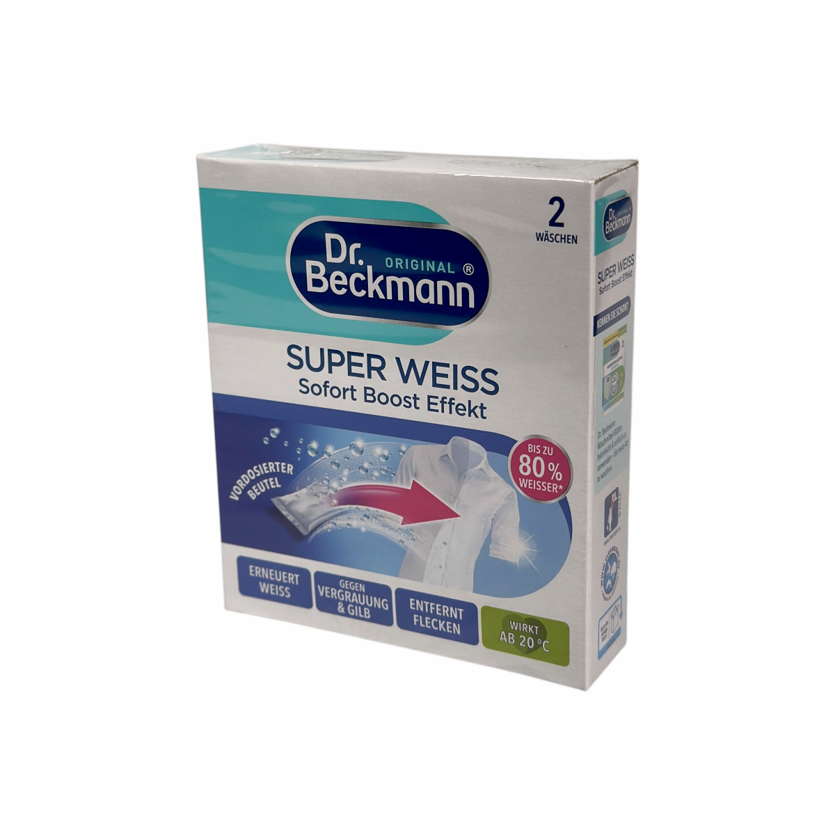 Dr. Beckmann Super Weiss — спеціальний засіб для відновлення білосніжності одягу та білизни з миттєвим ефектом до 80% яскравішого результату вже після першого прання.