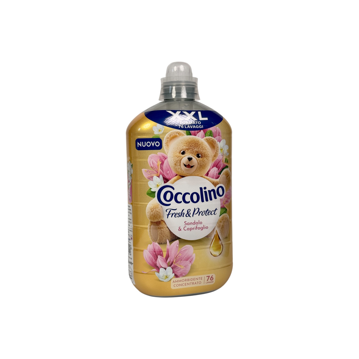 Coccolino Fresh & Protect Sandalo e Caprifoglio — італійський концентрований кондиціонер, що поєднує технологію Fresh & Protect для захисту тканин від неприємних запахів і дарує їм приємний, вишуканий аромат. Сандал забезпечує теплі деревні ноти, а каприфольо — ніжний квітковий акцент. Завдяки XXL-формату на 76 прань засіб є надзвичайно економним, зберігає м’якість білизни та полегшує прасування.