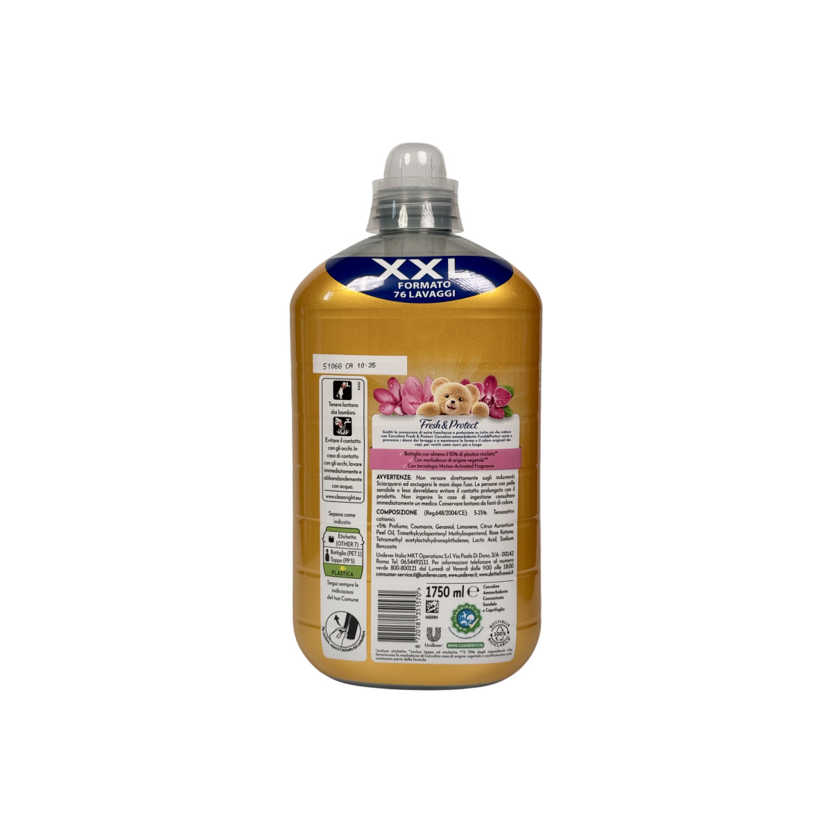 • Склад: 5–15% катіонні ПАР, ароматизатори (лімонен, гераніол, ліналоол, гексилциннамаль, бензилсаліцилат), консерванти (бензизотіазолінон, метилізотіазолінон)