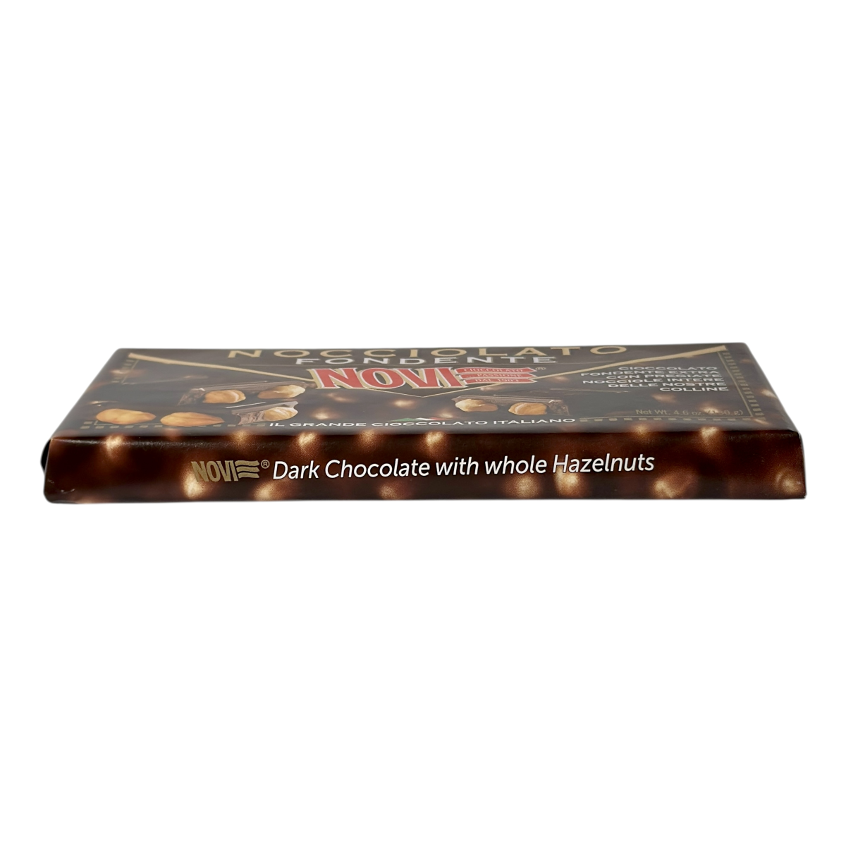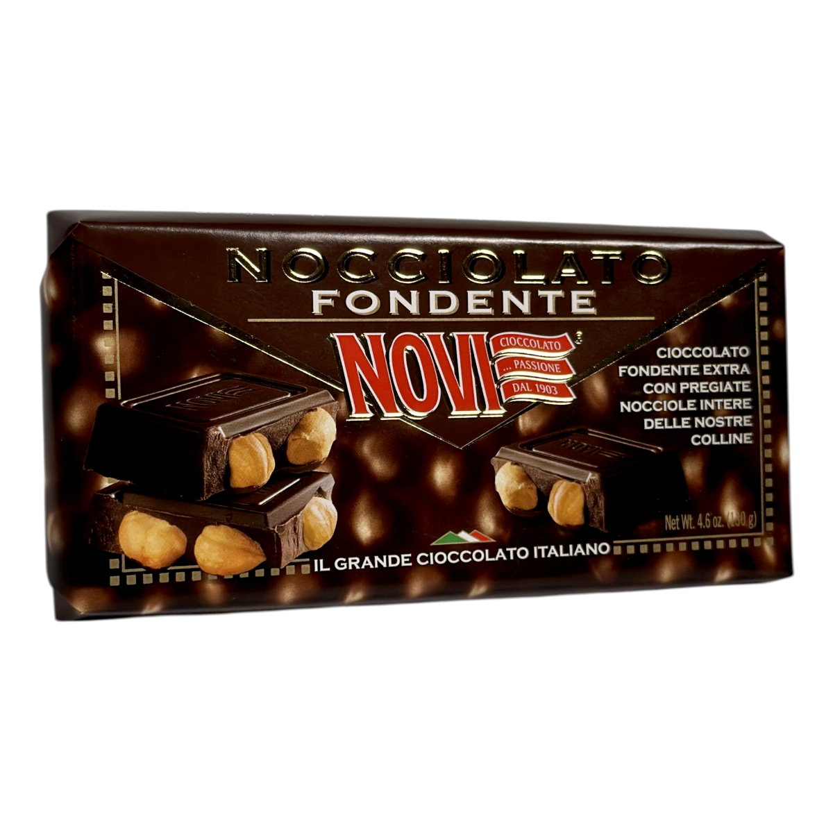 Італійський темний шоколад Novi Nocciolato Fondente — гармонійне поєднання насиченого чорного шоколаду (50% какао) та цілих лісових горіхів із північних пагорбів Італії.