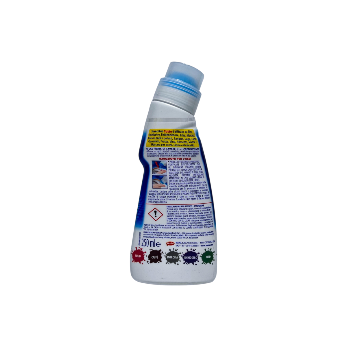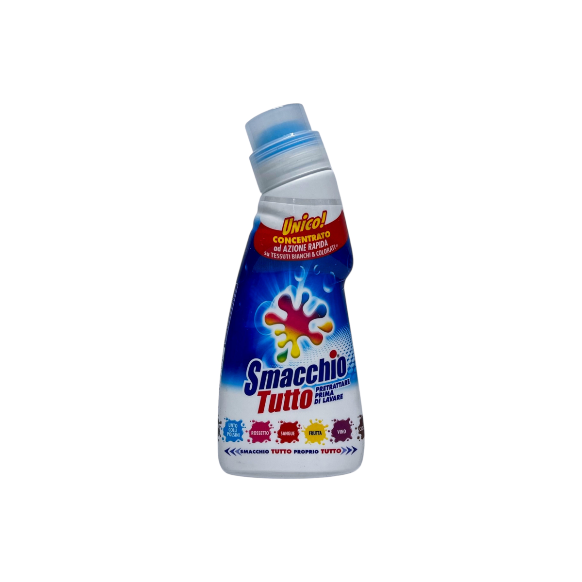 Smacchio Tutto – італійський засіб швидкої дії, створений спеціально для ефективного видалення найпоширеніших плям: жиру, вина, кави, крові, фруктів, соусів, губної помади, чорнила та багатьох інших. Завдяки концентрованій формулі він підходить для попередньої обробки як білих, так і кольорових тканин, не пошкоджує волокна й допомагає зберегти яскравість кольору. Зручний флакон з насадкою дозволяє легко наносити засіб безпосередньо на пляму.