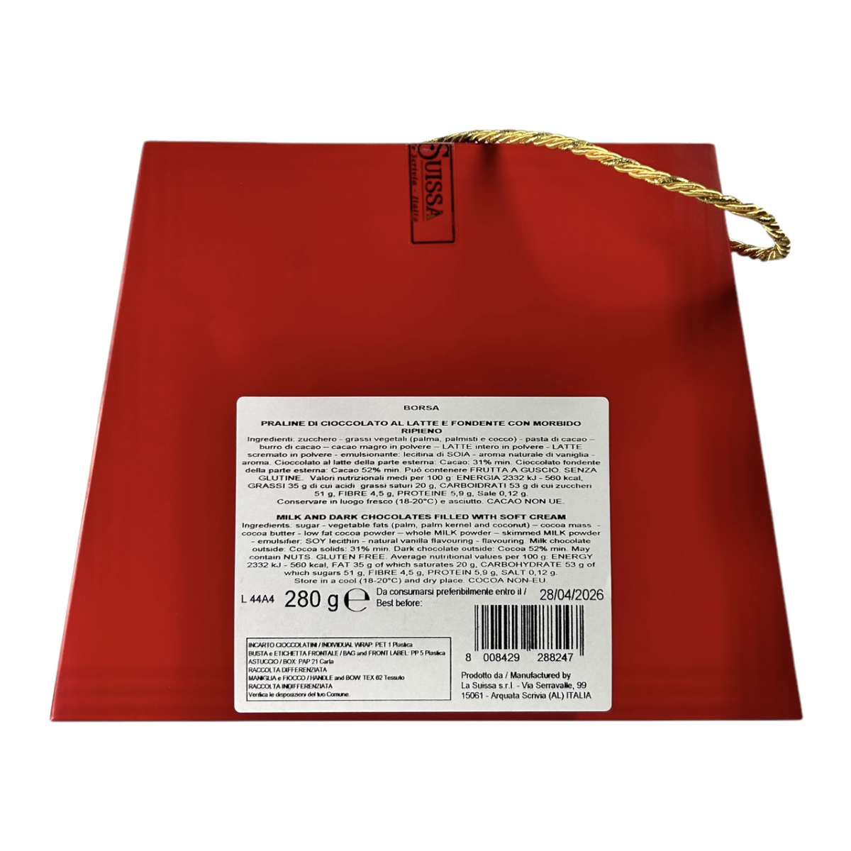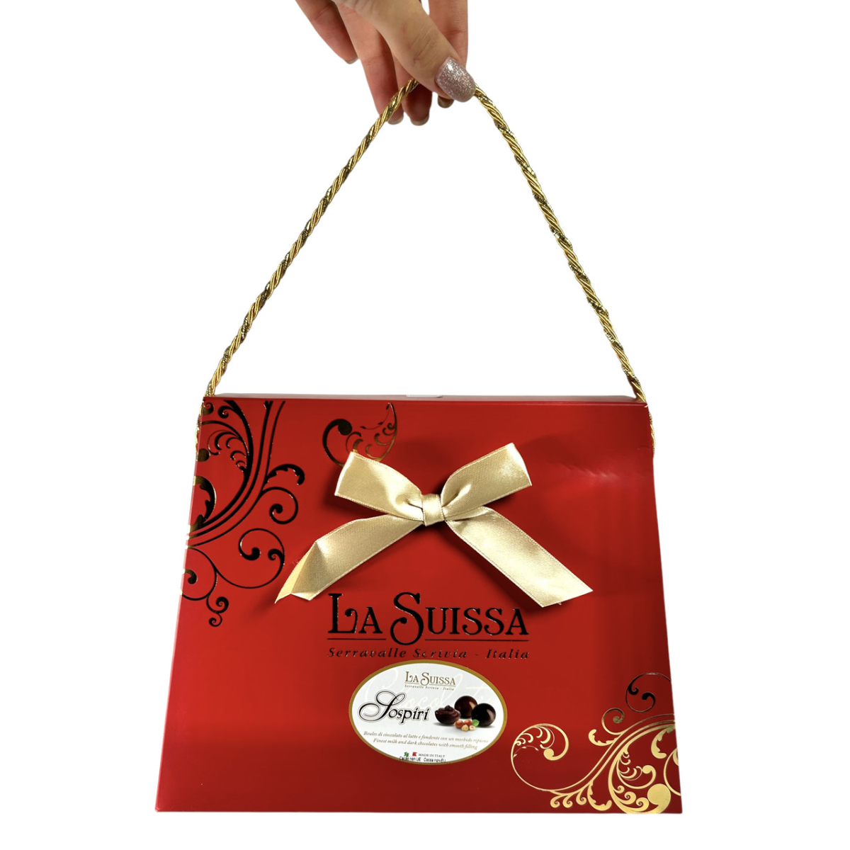 Елегантний подарунковий набір La Suissa Sospiri — це справжнє втілення італійського шоколадного мистецтва. У вишуканій червоній коробці з золотою стрічкою та ручкою-сумочкою зібрано асорті молочного та темного шоколаду з ніжною м’якою начинкою.